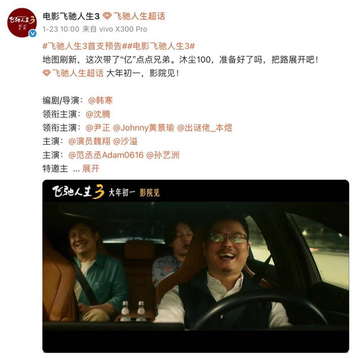 就在2026年春节档倒计时不足一个月的1月23日,《飞驰人生3》终于官宣定档并放出首支预告,全阵容曝光的瞬间直接点燃全网期待。