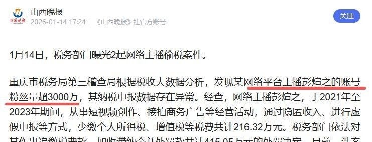 1月14日,国家税务总局发布权威通报,确认彭十六通过虚构业务合同、拆分劳务报酬、设立空壳公司等方式,刻意隐瞒真实收入,累计少缴个人所得税、增值税及附加税费共计216.32万元;最终依法追缴税款、加收滞纳金并处以罚款,合计金额达415.05万元。尽管她已全额补缴款项,但职业生命已然戛然而止。